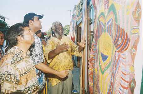 his murals on fabric. In forefront is Housing and Water Minister Shaik Baksh.