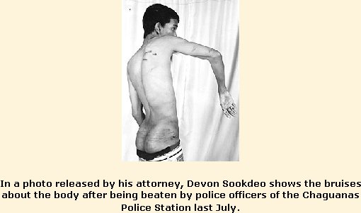 Chaguanas teenager Devon Sookdeo who was beaten about the body by three police officers with a bull pistle in 2004 has won his legal battle against the Attorney General. When the matter was called before San Fernando Chamber Court judge Charmaine Pemberton on Tuesday, the State agreed to pay him damages. Sookdeo, 18, of Goodwill Road, Chaguanas, through attorney Anand Ramlogan, had filed a wrongful arrest and detention, assault and battery case against the State. He claimed that three officers, PCs Adams, Calliste and Valdez attached to the Chaguanas Police Station, arrested him at his home on July 13, 2004, at 11.30 pm. Sookdeo stated that they handcuffed him, took him to the station where he was placed in a cell and beaten. He was held at the station from midnight to 6.30 am. He said he asked why he was arrested but was verbally abused and threatened. The police eventually allowed him to leave on July 14 at 7 am. Sookdeo said on July 26, 2004, at 1.04 am the same policemen returned to his home and arrested him again. He was taken to the station where he was ordered to take off his T-shirt and pull down his pants. He was beaten about the body with a bull pistle and other devices. After the beating he was thrown in a cell where he was left bruised and bleeding. He was charged with possession of marijuana and was threatened by the policemen to plead guilty. He said at no time he was informed of his constitutional rights and right to consult or retain a lawyer. Sookdeo said he was not allowed to make a telephone call while he was in custody. On Tuesday, Pemberton ordered that, by consent of state attorney Sajeev Lalla, damages be paid. She declared the arrest and detention was unlawful and the refusal of the police to inform Sookdeo of his rights to retain an attorney and communicate with him was unconstitutional and illegal. The State accepted liability for the actions of the police through its consent order. |