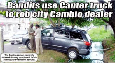 The incident occurred at around 15:15 hours, minutes after the businessman had picked up his eight-year-old daughter from a private school in the area. Speaking after the incident, a visibly traumatized Sarjoo, 36, of A and N Sarjoo Cambio on America Street , recalled that as he was approaching the junction of Third Avenue and Church Road , a white Canter suddenly blocked his path. He said that he saw about nine men, one of whom wore a mask, approaching him with guns drawn. Sarjoo stated that, sensing that he was the target of the attack, he immediately put his vehicle in reverse and tried to evade the gunmen. But in his haste, he lost control of the vehicle, which veered onto the parapet and narrowly missed going overboard in a nearby trench. In a flash, the gunmen had pounced; and after cautioning him, they hauled him from the vehicle and ordered him to lie on the roadway. “They say, ‘don't move or we gon kill you',” Sarjoo said. At the time of the attack, Sarjoo was in the company of one of his employees, Mohamed Raza, who was carrying a quantity of cash on his person. The men relieved him of his firearm and a bag containing some documents before confronting the employee and taking away the cash that he was carrying. He said that the men did not hurt his daughter, who was traumatised by the ordeal. The bandits then re-entered their truck and sped south along Church Road , Subryanville. It is believed that, after fleeing the scene, some of the bandits used another vehicle in their escape. An eyewitness said that as the Canter truck was speeding off, some of the bandits “fell out” and they then entered another waiting vehicle. Residents of the area recalled seeing the truck parked at the junction minutes before the incident. However, they did not pay much attention to it, since the men appeared to be effecting mechanical repairs. It was not until the robbery had occurred that they realised the men who appeared to be construction workers were actually bandits. Several dumbstruck parents who had also collected their children from the school stared in shock at the vehicle perched over the trench. The police were summoned and took fingerprints from Sarjoo's vehicle to aid in their investigations. The businessman, whose father, Neville Sarjoo, was gunned down outside his business place on America Street in May 1998, said that he is thankful that no one was badly hurt, although he suffered an abrasion on his head which was caused by a blow from a gun carried by one of the bandits. Thursday 10-25-2007