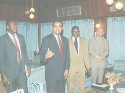 ![]() President Bharrat Jagdeo, second from left, with United Nations Special Rapporteur on Contemporary Forms of Racial Discrimination, Xenophobia and related Intolerance, Mr Doudou Die’ne, on his left, before engaging in discussions at the Office of the President. Flanking are Mr Doudou Die’ne’s assistant, Mr. Daniel Atchebro, left, and new UNDP Resident Representative, Mr Jan Sand Sorensen, extreme right. (Cullen Bess Nelson photo) |